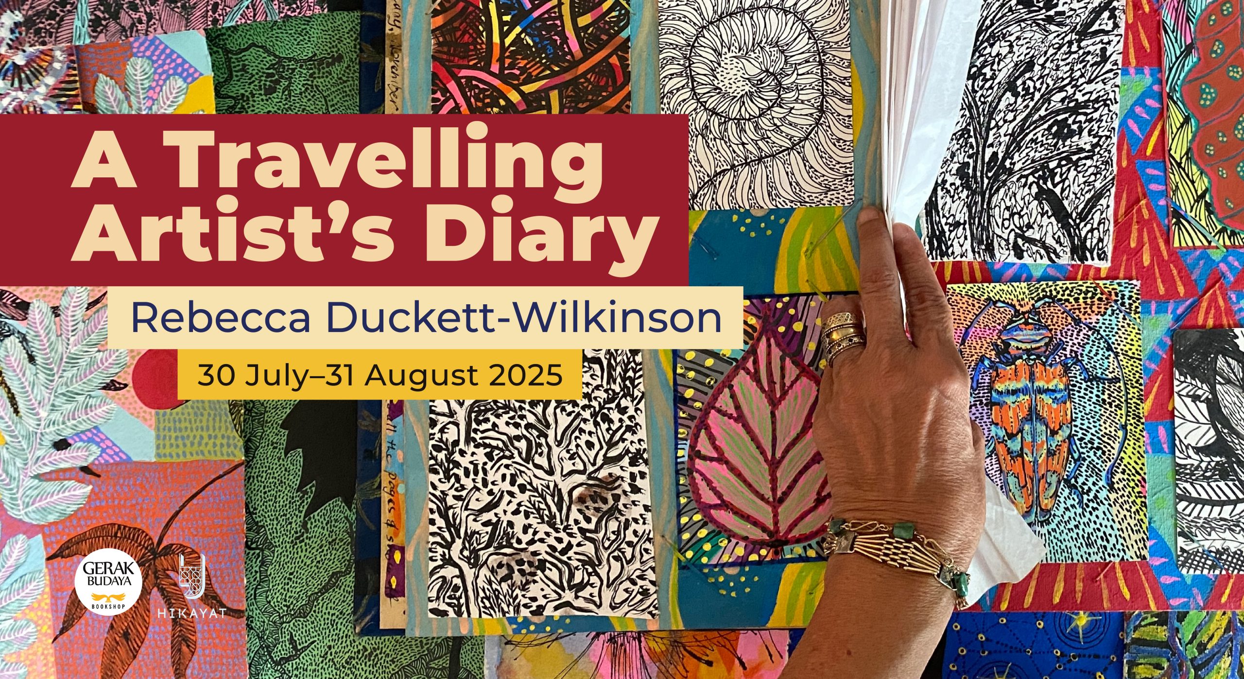 “A Travelling Artist’s Diary” is an exhibition about Rebecca Duckett-Wilkinson’s art process through time, and how she works towards the development of her art. The personal life story is woven intimately into the many layers of the artwork. Key aspects of this biography include the impact of her childhood on how she began as an artist; how her parents shaped her ambitions as an artist; the life choices she made with her husband, such as the travels that continually intertwine her life to her art. There is not one without the other. These interconnections are at the centre of how Rebecca works. This exhibition is a sharing of her everyday practice through time, featuring paintings, mobiles, installations, sketchbooks, and so on. Malaysia and its flora and fauna are her first and biggest inspiration. Nearly all the pieces in the exhibition are artworks not previously shown. They are, she says, ‘like precious talismans’. In addition, Rebecca will set up an artist’s studio at Hikayat for the entire duration of the exhibition so that visitors can see her working methods and talk to her.